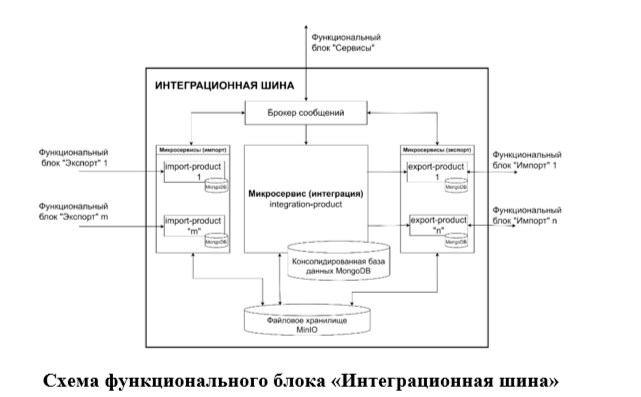 - функциональный блок «Интеграционная шина» – ПО, обеспечивающее интеграцию с внешними системами и миграции данных из замещаемых систем в целевые и в собственный информационный ресурс, который ведется в КБД. Решает задачи обработки, хранения и управления КТД, обеспечивает задачу протоколирования процессов интеграции и/или миграции;