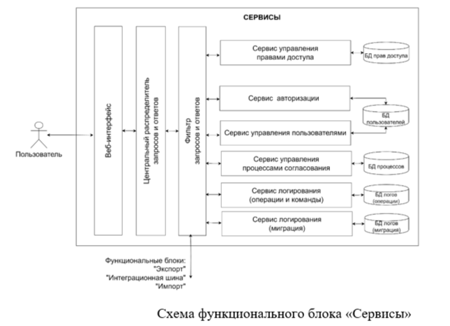 - функциональный блок «Сервисы» ‒ ПО, реализующее группу функций обеспечения доступа к функциональности Системы;