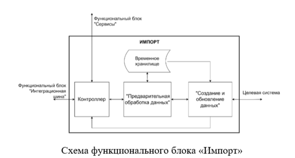 - функциональный блок «Импорт» – ПО, обеспечивающее взаимодействие между функциональным блоком «Интеграционная шина» и целевой системой. Решает задачу импорта КТД во внешнюю систему.
