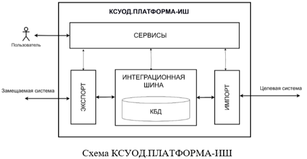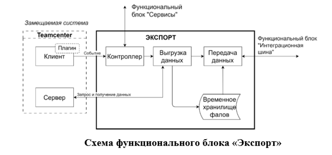 - функциональный блок «Экспорт» ‒ ПО, обеспечивающее взаимодействие функционального блока «Интеграционная шина» с внешней замещаемой системой. Решает задачу экспорта КТД из внешней системы.